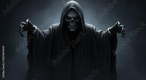 death, skeleton, skull, horror, dark, skittish, cloak, hood, supernatural, afterlife, mortality, grim, reaper, doom, evil, darkness, ghoul, monster, fantasy, nightmare, fear, terrifying, halloween, ghost, spirit, undead, creature, ghastly, grisly, ominous, sinister, shadow, silhouette, bone, bony, decaying, scarey, creepy