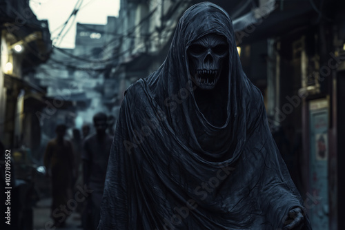 horror, dark, death, skeleton, alley, fear, haunting, mysterious, eerie, scarey, skull, urban, shadow, danger, supernatural, night, creepy, gothic, fantasy, nightmare, skittish, menacing, villain, ghostly, grim, atmosphere, sinister, foreboding, halloween