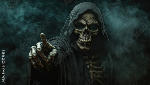 death, skeleton, skull, robe, black, smoke, haunting, pointing, finger, dark, horror, halloween, ghostly, mystical, creepy, frightening, spectral, eerie, ominous, shadowy, grisly, gothic, deathly, uncanny, gloomy, chilling, foreboding, supernatural, grim, morbid, skittish, scarey, terrifying, shadow, fantasy, undead, evil
