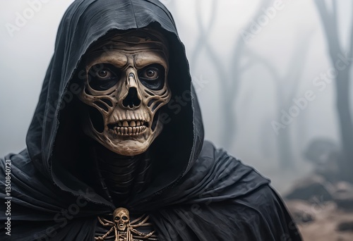 death, skull, skeleton, cloak, forest, wood, fog, misty, mysterious, skittish, scarey, halloween, horror, gothic, dark, grisly, supernatural, fantasy, occult, creepy, ominous, threat, danger, evil, undead, paranormal, autumn