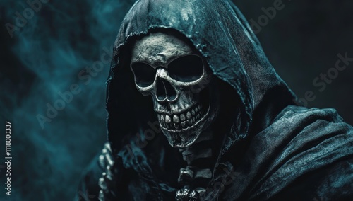 grim, reaper, skeleton, skull, hooded, cloak, smoke, shadow, dark, death, halloween, horror, fantasy, mystical, spirit, ghost, grisly, evil, creepy, frightening, ominous, eerie, gloomy, mysterious, foreboding, haunting, supernatural, gothic, bone, face, eye, teeth, jaw, robe, fabric, texture, background, colours, mask, monster, scarey, zombie, black, costume, people, paint, dead, head
