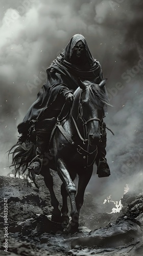 Grim Reaper Riding Fiery Steed Across Desolate Landscape in Dramatic Monochrome