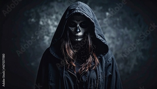 Grim reaper style hooded death figure in dark clothes, abstract concept of evil, ghost, and horror with eerie grunge atmosphere.