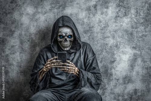 grim, reaper, death, skeleton, skull, phone, texting, hooded, robe, black, grey, wall, creepy, horror, halloween, deathly, scarey, frightening, ominous, grisly, dark, gloomy, eerie, mystical, supernatural, digital, technology, cyberspace, smartphone, social, media, modern, earth, future, abstract, concept, art, photo