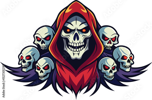skull, skull, death, halloween, horror, skeleton, cloak, hood, red, evil, skittish, scarey, creepy, vector, illustration, cartoon, character, mascot, design, art, graphic, symbol, icon, signs, isolated, white background, undead, monster, fantasy, nightmare, dead, bone, anatomy, head, face, eye, teeth, jaw, bone, gothic, dark, grisly, occult, supernatural, mythology