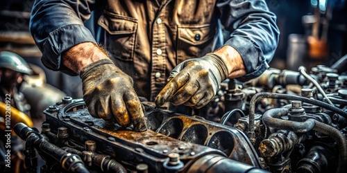 Gritty Close-Up of Mechanic's Hands Working on Engine, Detailing the Engine's Complexity and Gritty Textures