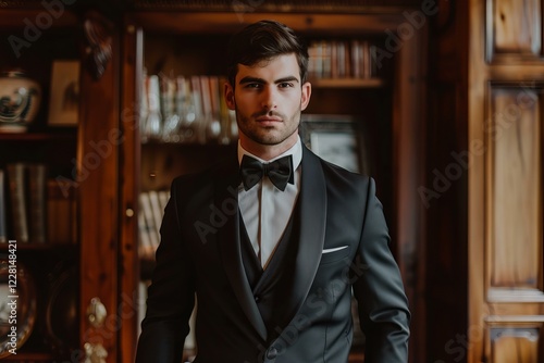groom, wedding, tuxedo, bow, attaching, luxury, hotel, library, man, portrait, elegant, style, fashion, businessman, success, confidence, getting, ready, ceremony, celebration, romance, love, marriage, photogenic, sophisticated, posh, interior, book, bookshelf, wooden, furniture, background, dark, rich, traditional, vintage, posing, day, preparation, room, classic, confident, successful, romantic, atmosphere