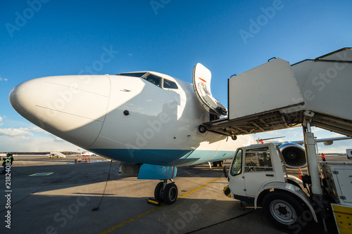 Ground maintenance of white modern passenger civil airplane at international airport
