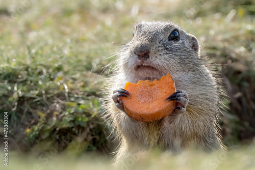 Groundhog peeks out of the burrow in the meadow and eats carrots.