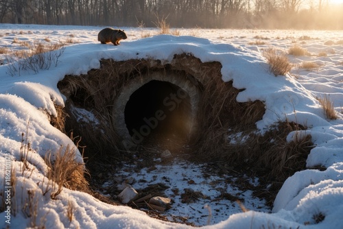 groundhog, burrow, shadow, sunrise, winter, february, folklore, seasonal, wildlife, cute, silhouette, no people, nature, cold weather, frost, golden light, countryside, tradition, prediction, early spring, copy space, hi-res, soft light, mammal, rodent, outdoors, morning, calm, serene, photorealistic, winter landscape, animal portrait, horizon