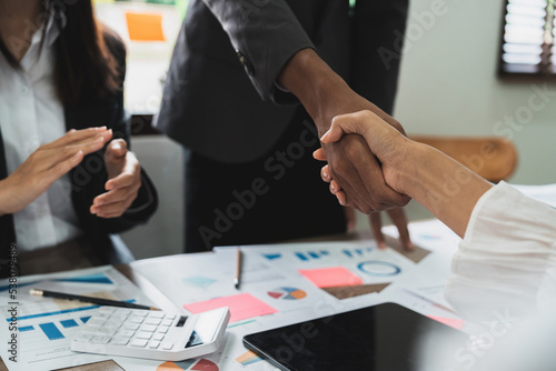 Group business people handshake at meeting table in office together with confident shot from top view . Young businessman and businesswoman workers express agreement of investment deal.