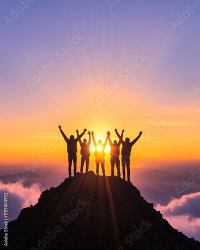sunset, mountain, group, oneness, triumph, scenic, breathtaking, hiking, celebration, adventure, inspiration, optimism, dream, captivating, calm, freedom, teamwork, serene, morning, picturesque, exploration, invigorating, exhilaration, landscape, peace, wanderlust, silhouette, ascent, inspiring, atmospheric, climbing, journey, tranquil, sky, sunrise, expedition, harmony, nature, uplifting, motivation