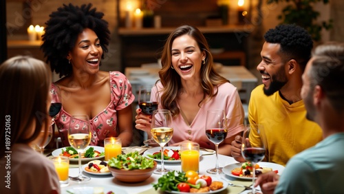 group four young people sitting around dining table restaurant smiling laughing enjoying meal together table set plates food glasses red wine background blurred appears dimly lit restaurant candles