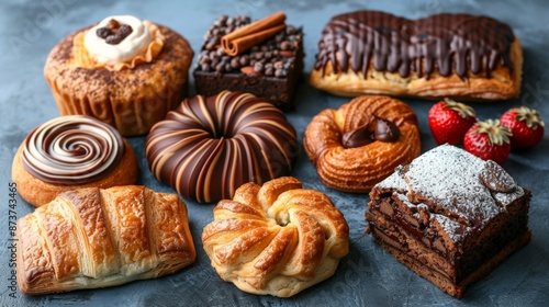Group of assorted pastries isolated on blue background. Pastry, cakes, buns, biscuits, sweets.