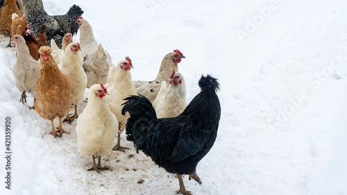 Group of beautiful domestic white hens and black rooster are walking through snow on a snowy winter day.. Chicken farm concept.