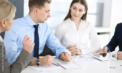 Group of business people discussing questions at meeting in modern office. Managers at negotiation or brainstorm. Teamwork, partnership and business concept