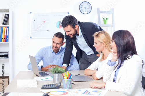 Group Of Business People Having Meeting In Office. Business partners discussing documents and ideas at meeting