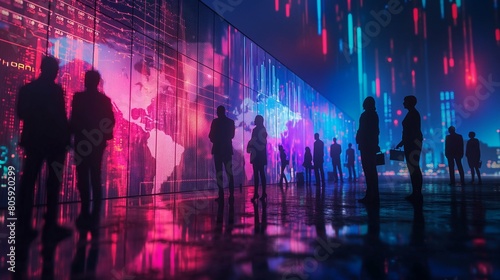 Group of business people in silhouette standing and talking, digital screen displaying graphs of global data and a world map, a futuristic neon background, in the style of digital technology concept