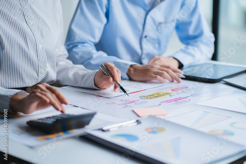 Group of business people meeting together Pointing to the graph assess business profits.