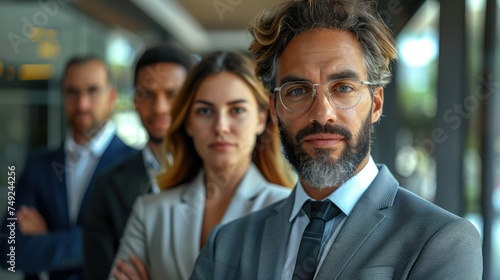 Group of business people wearing suits, men and women, they are all looking at the camera, technological background. Generative AI.