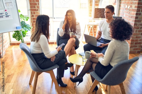 Group of business workers smiling happy and confident. Sitting on chairs relaxed with smile on face. Speaking taking rest at the office
