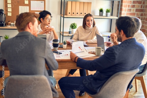 Group of business workers working together. Sitting on desk using laptop reading documents at the office