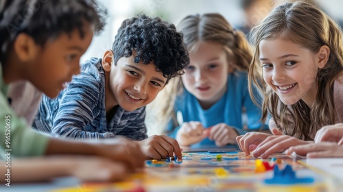 Group of children playing educational board games, promoting teamwork and problemsolving skills, learning activities, interactive play