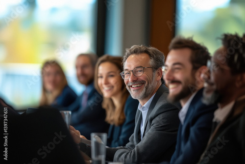 Group of colleagues engaging in a discussion during a business meeting in a conference room.