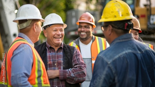 Group of construction professionals smiling in a team meeting outdoors