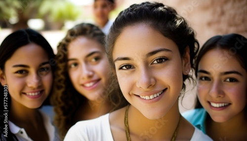 Group of Diverse and Empowered Hispanic Youth Female High School Students Working Together in Student Government : Power of Collaboration in Clubs, Sports Teams (generative AI)