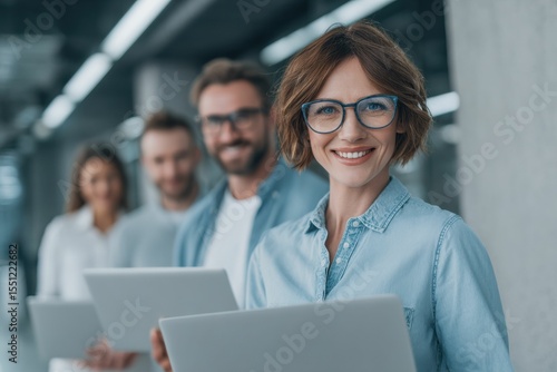 Group of diverse professionals in a modern office setting, smiling and engaging with each other in a collaborative atmosphere.