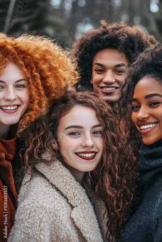 friends, group, diverse, woman, man, curly, hair, smiling, outdoors, autumn, friendship, young, fashion, warm, clothing, happiness, joy, multicultural, togetherness, nature, cheerful, oneness, gathering, fun, trendy, youth, lifestyle, scenic, bonding, casual attire, vibrant, social, energy, laughing, approachable, community, city, winter, expression