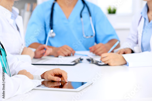 Group of doctors at medical meeting. Close up of physician using tablet computer.