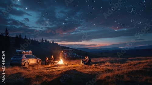 Group of friends camping with a bonfire under a starry sky in a scenic mountain landscape
