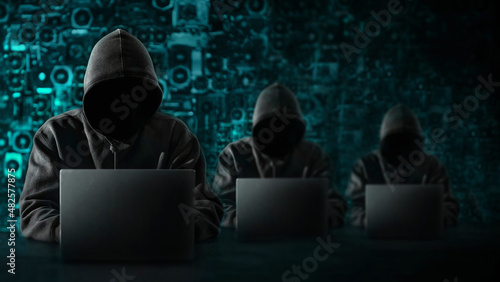 group of hackers with a hidden faces and with a laptops sits at the table, blue background. There is an hourglass on the hacker's desk