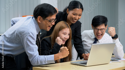 Group of happy asian business people sitting on a table raised fists cheering at laptop celebrating achievement goals to success in meeting at office