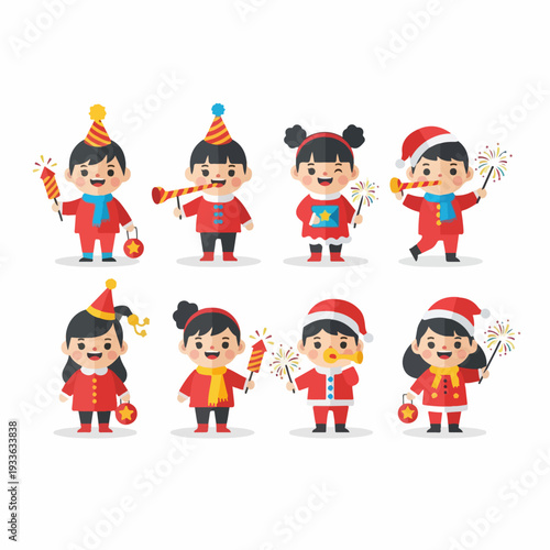 children, happy, celebration, party, festive, holiday, new year, christmas, cartoon, illustration, vector, children, boy, girl, smiling, joyful, cute, red, fireworks, sparkler, horn, lantern, festive season, winter, holiday season, event, fun, childhood, togetherness, playful, adorable, graphic, character, set, collection, festival, traditional, seasonal, greeting, card, background, isolated, white background, youth, december, jan