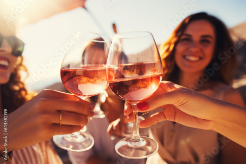 Group of happy female friends celebrating holiday clinking glasses of rose wine in Santorini