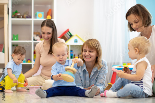 Group of happy moms with their babies in nursery. Preparing children for kindergarten