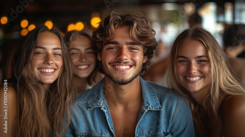 Group of happy young friends, smiling brightly, enjoying time together in a cozy setting, friendship and joy concept