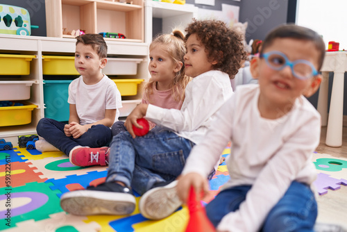 Group of kids sitting on floor smiling confident at kindergarten