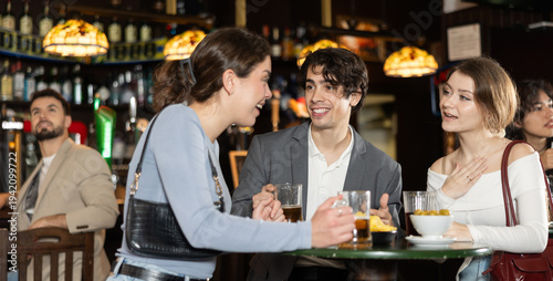 Group of male and female friends sit at table in bar enjoying conversation and drinking cold beer