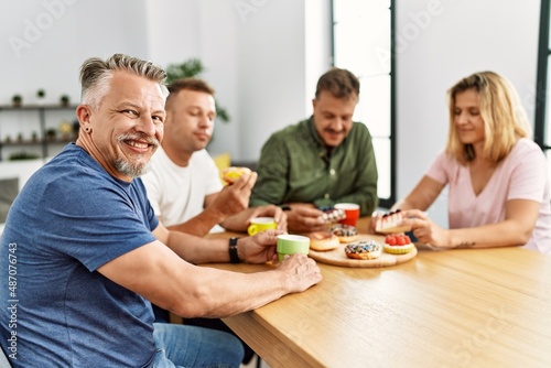 4, apartment, beverage, breakfast, caucasian, hot drink, comfortable, cup, donut, donut, drinking, enjoy, expression, face, food, 4, friends, fun, group, happy, home, house, indoor, lifestyle, living, living room, man, mature, meal, man, morning, people, portrait, human relationships, relaxed, relaxing, rest, resting, room, senior, sitting, smile, smiling, studio, sugar, sweet, table, together