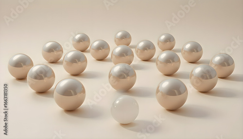 Group of multiple shiny silver spheres arranged on light surface, creating a reflective metallic composition with smooth polished surfaces and minimalistic style