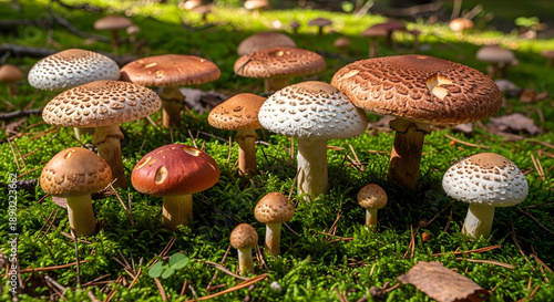 mushroom, nature, forest, group, fungal, growth, moss, brown, white, organic, wood, plant, greenery, healthy, ecological, summer, vibrant, environment, flora, detail, wild, sprouting, landscape, agriculture, earth, connected, life, harvest, foraging, edible, spore, small, closeup, macro, sunlight, seasonal, colourful, biodiversity, fresh, natural, texture, beauty, scene, quiet, peaceful, wildness, ground, underbrush