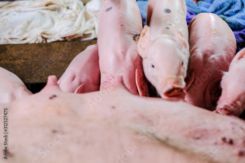 Group of newborn piglet sucking milk feed from pig in traditional farm