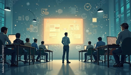 Group of people learning. Man giving presentation to group. Many screens show info. Modern business class. Lifelong learning and its impact. People taking notes.