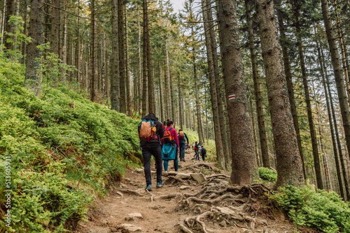 Group of people of tourists in sportswear with backpack hiking through the forest to the top of the mountain, amazing nature back view.