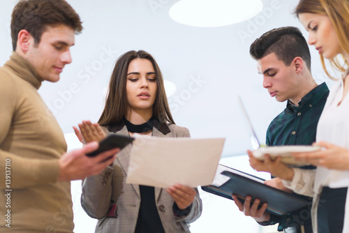 Group of people standing close to each other while and gesturing. Group of students preparing for exams discuss in the hall.
