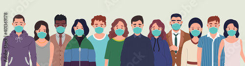 Group of people wearing protective medical masks for protection from virus. Prevention and safety procedures concept. Flat style illustration